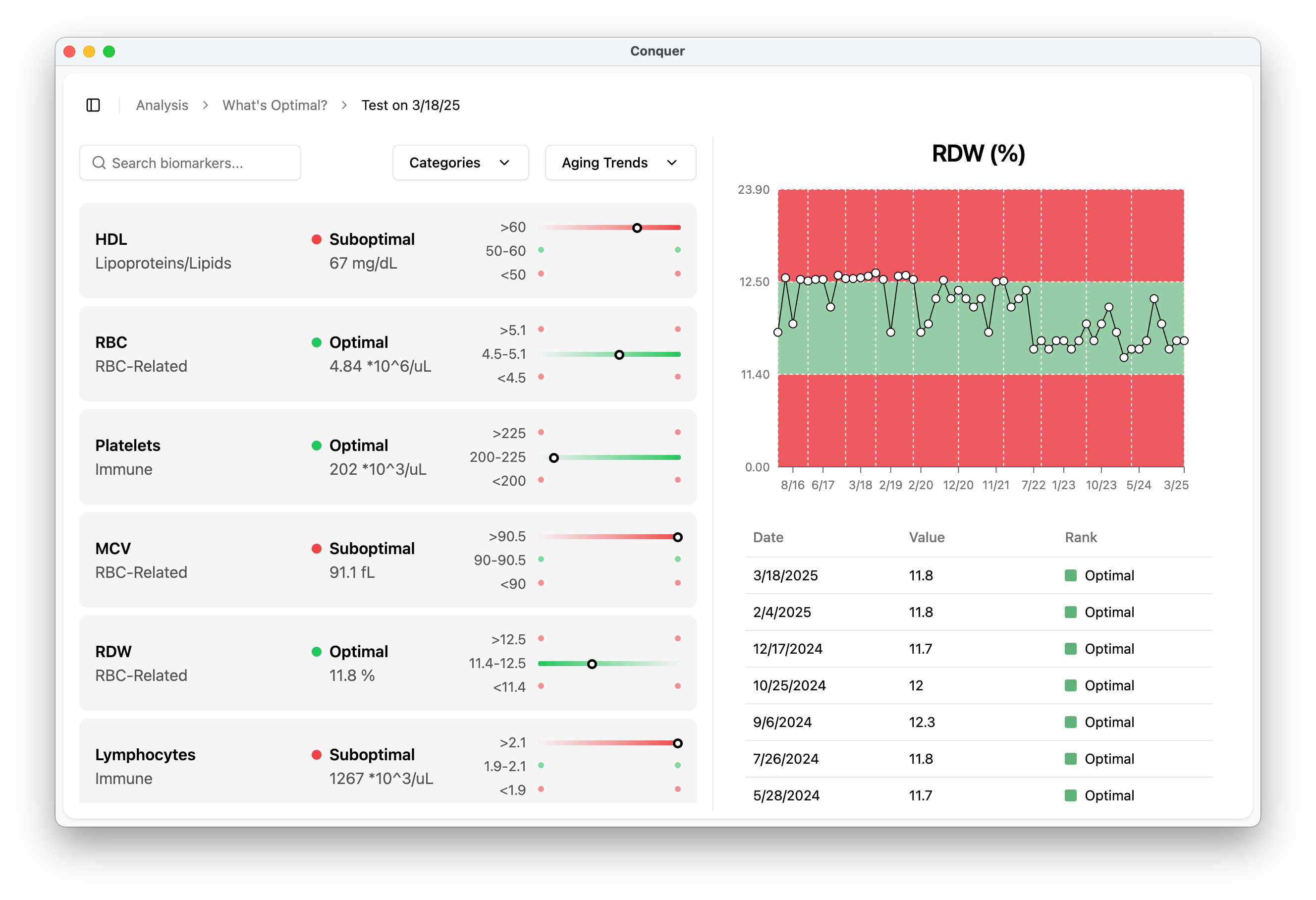 See an overview of each of your blood tests to see if your biomarkers are optimal, aging, or resisting aging.